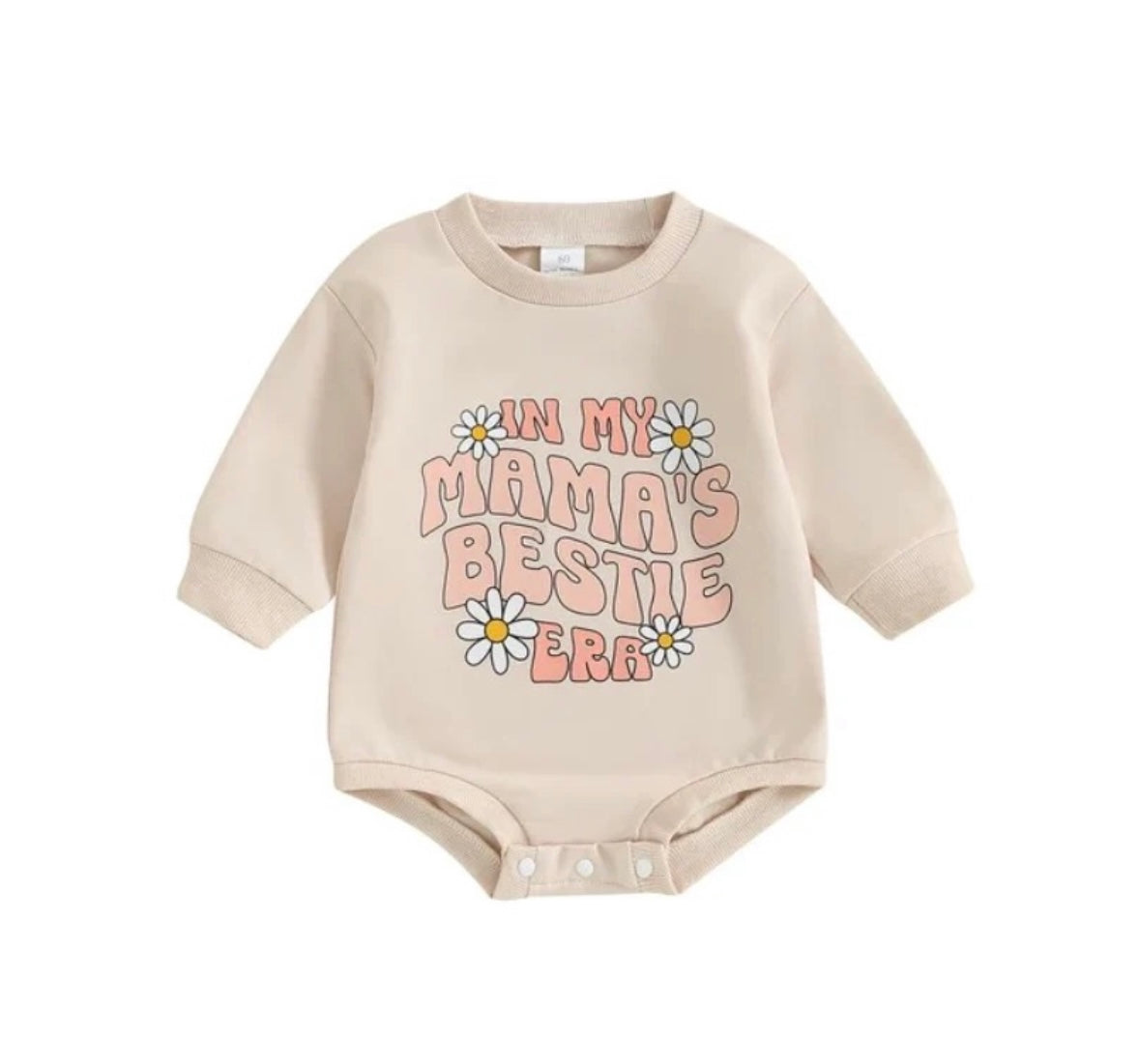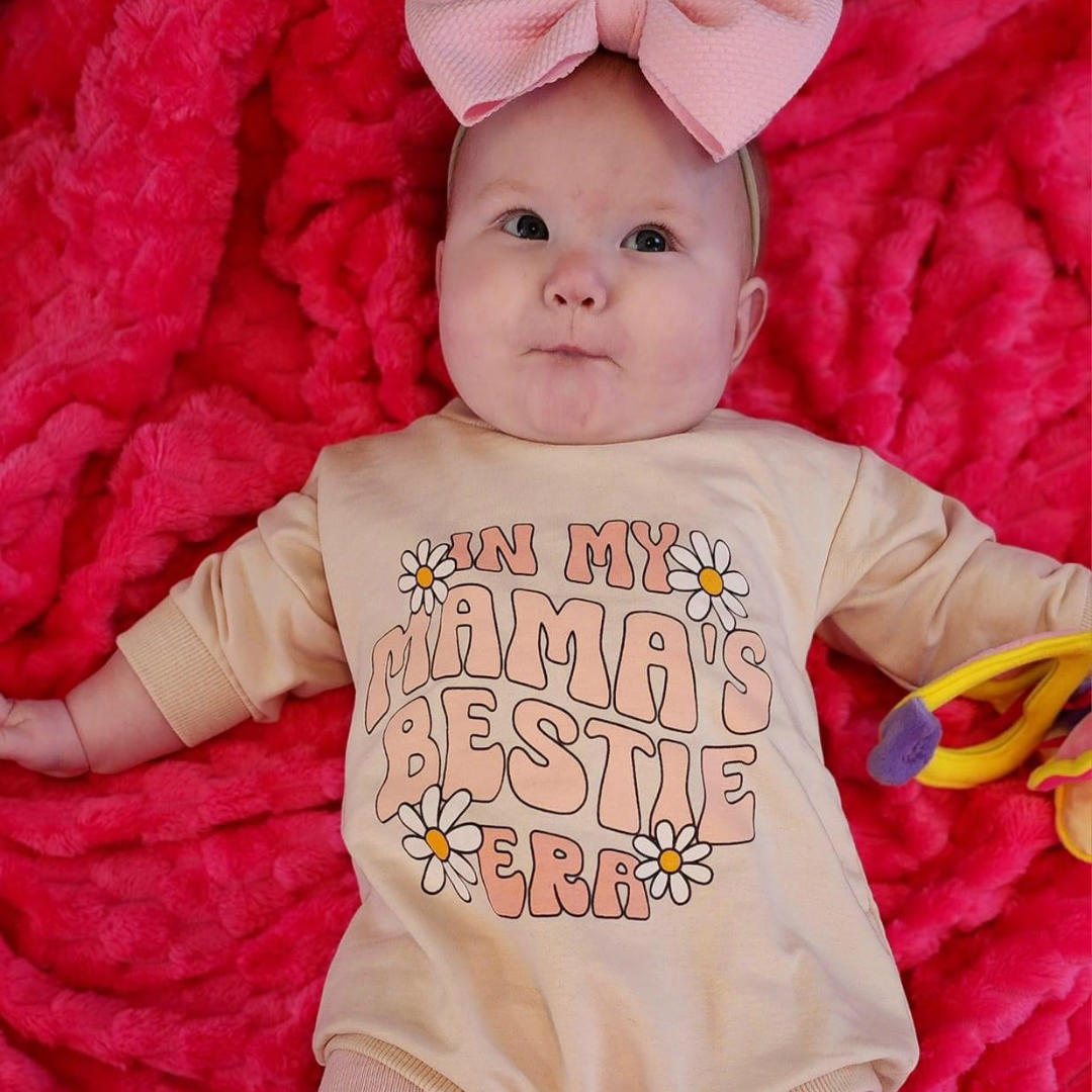Introducing Mama's Bestie Era Bubble, the perfect baby romper for mamas little bestie! Made with high-quality material, this romper is both comfortable and fashionable. Let your little one be the best dressed with its adorable design. Say goodbye to boring baby outfits and hello to Mama's Bestie!
